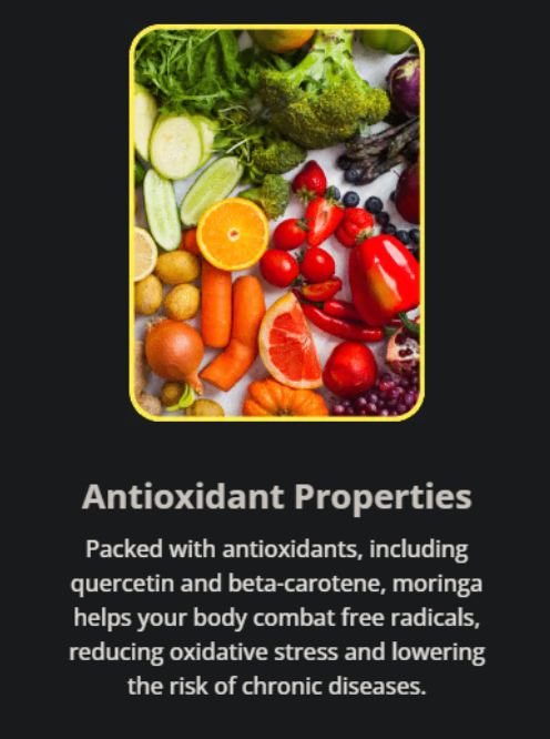 Reich an Antioxidantien, darunter Quercetin und Beta-Carotin, hilft Moringa deinem Körper, freie Radikale zu bekämpfen.Dies reduziert oxidativen Stress und senkt das Risiko für chronische Krankheiten.