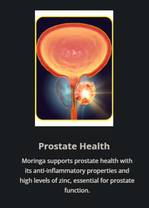 Moringa unterstützt die Prostatagesundheit dank seiner entzündungshemmenden Eigenschaften und seines hohen Zinkgehalts, der für eine gute Prostatafunktion unerlässlich ist.