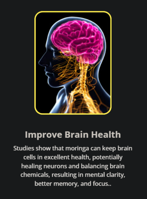 Studien zeigen, dass Moringa Gehirnzellen in ausgezeichnetem Zustand halten kann, möglicherweise Neuronen bei der Regeneration unterstützt und Gehirnchemikalien ins Gleichgewicht bringt.Dies führt zu mehr mentaler Klarheit, einem besseren Gedächtnis und gesteigerter Konzentration.