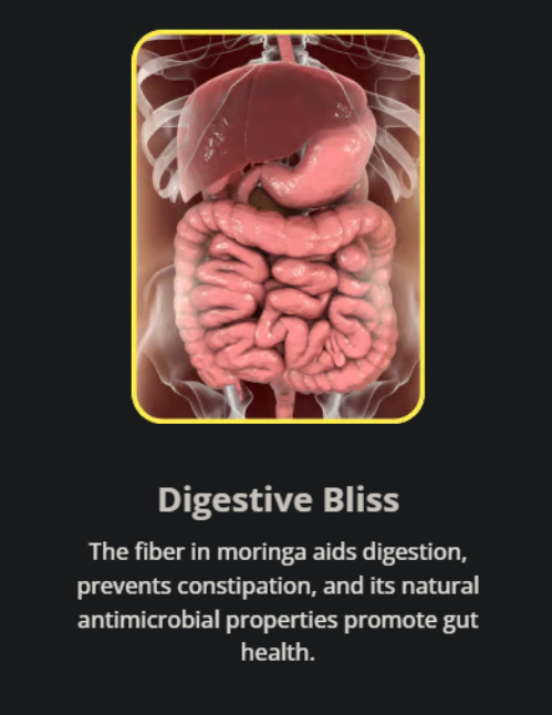 Die Ballaststoffe in Moringa unterstützen eine gesunde Verdauung, helfen Verstopfung vorzubeugen und fördern dank ihrer natürlichen antimikrobiellen Eigenschaften eine bessere Darmgesundheit.