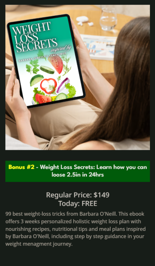 Du erhältst einen 3-Wochen ganzheitlichen Plan mit nahrhaften Rezepten, Ernährungstipps und Mahlzeitenplänen – alle inspiriert von Barbara O’Neill.